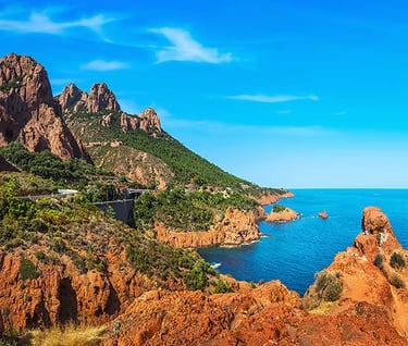 Nous, c'est ici entre le bleu azur de la Mer Méditerranée et le rouge des roches du Massif de l'Estérel que nous avons voulu notre coin de paradis.