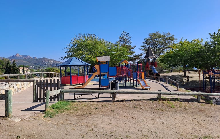 Pendant que les plus petits profitent des toboggans, balançoires et jeux d’éveil, les parents peuvent se détendre à l’ombre des oliviers.